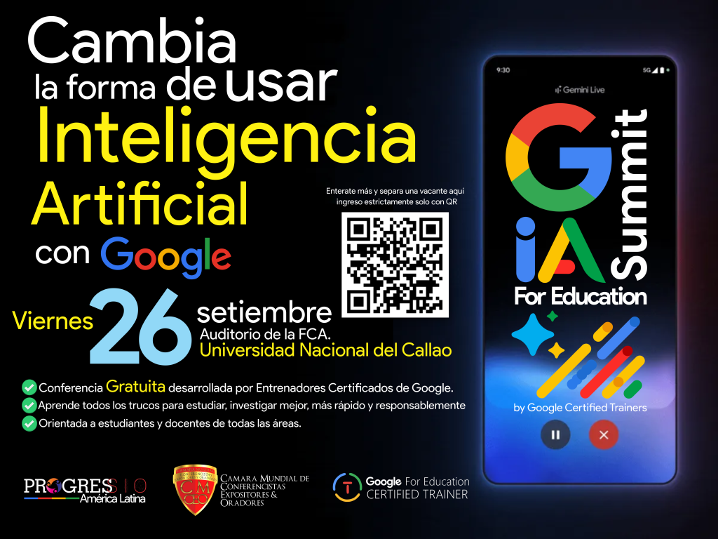 Agradecidos por atendernos personalmente y extraordinariamente, sabemos del compromiso y la dedicación que le dan a las actividades educativas de envergadura internacional. Nos complace confirmar la realización de la cumbre internacional “Google IA SUMMIT for Education”, un evento de alto nivel orientado al análisis y aplicación de la Inteligencia Artificial en el ámbito educativo. Esta conferencia será desarrollada por entrenadores certificados por Google, quienes abordarán herramientas, estrategias y metodologías aplicables a todos los niveles del sistema educativo.